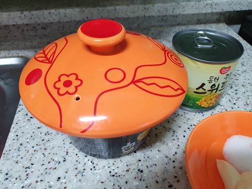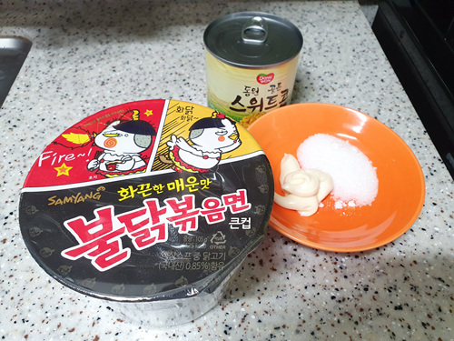 불닭 볶음면 1개 (or 불닭 볶음면 컵라면 큰 컵 ), 모짜렐라 치즈, 스위트 콘, 설탕/ 마요네즈