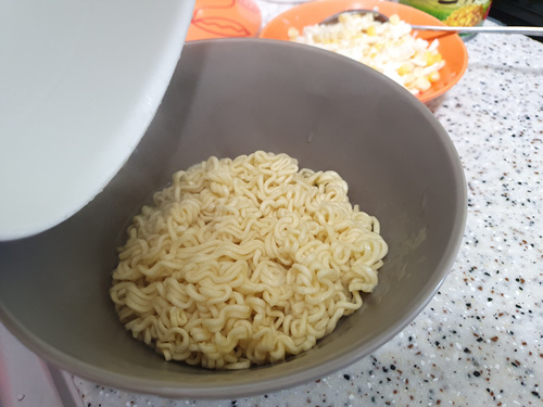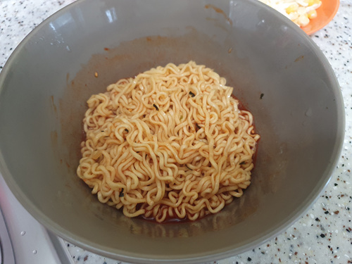 물에 다 불려진 면은 그릇에 옮겨 담은 뒤 불닭 소스를 넣고 섞어 줍니다.