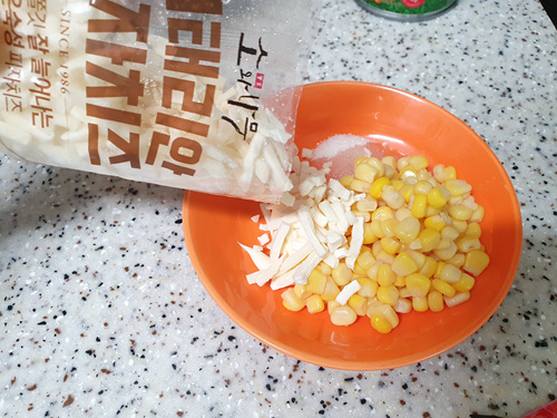 불닭 볶음면이 익을때까지 준비된 모짜렐라 치즈, 마요네즈, 스위트 콘, 설탕 1스푼을 섞어 줍니다.