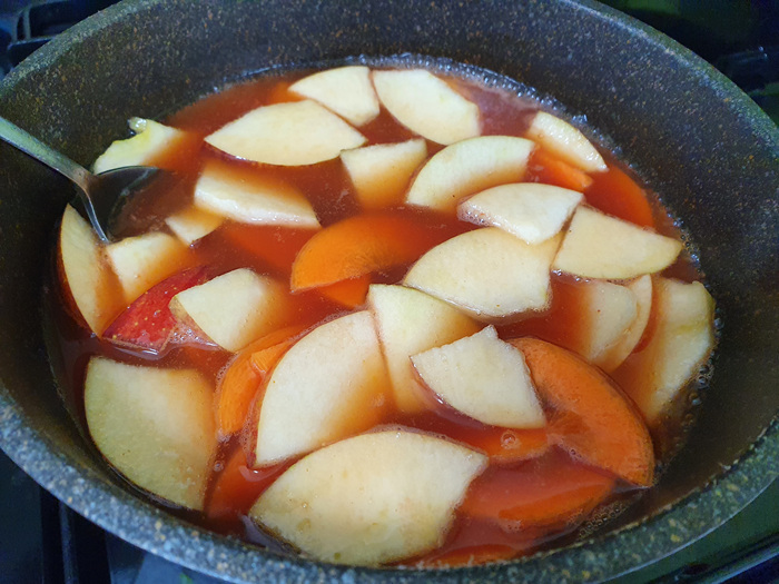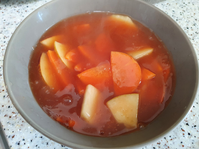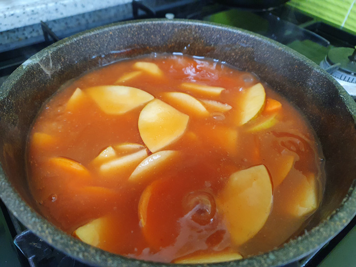 고기를 튀기기 전 미리 탕수육 소스를 만듭니다. 그래야 고기를 튀기고 바로 먹을 수 있으니까요.