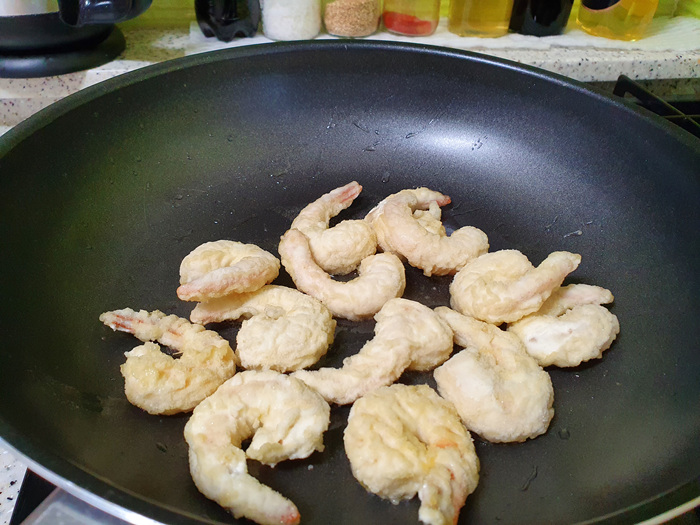 조리방법은 프라이팬에 기름을 넉넉히 붓고 가열한 후 냉동 상태 그대로 새우를 넣어 조리하고 그다음 소스를 버무려 한 번 더 조려주면 됩니다. 사실 쉽기는 한데 온 사방에 기름이 튄다는 단점이 있으니 프라이팬 덮개 꼭 준비하고 요리해 주세요.