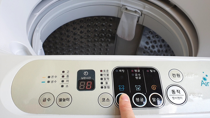 물의 높이는 중이나 고수위로 해도 상관없어요. 하지만 이불이나 큰 사이즈의 빨래라면 물은 중 정도의 수위로 해서 세제를 풀어 줍니다.