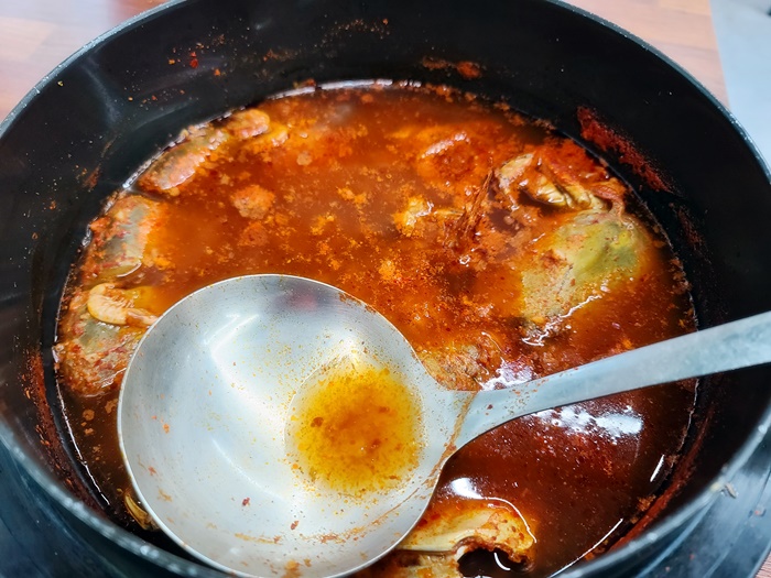 먹다 남은 듯한 국물을 국자로 살짝 저어 보니 게와 메기가 함께 들어 있었습니다. 그래서 국물이 그렇게 시원했나 봅니다.