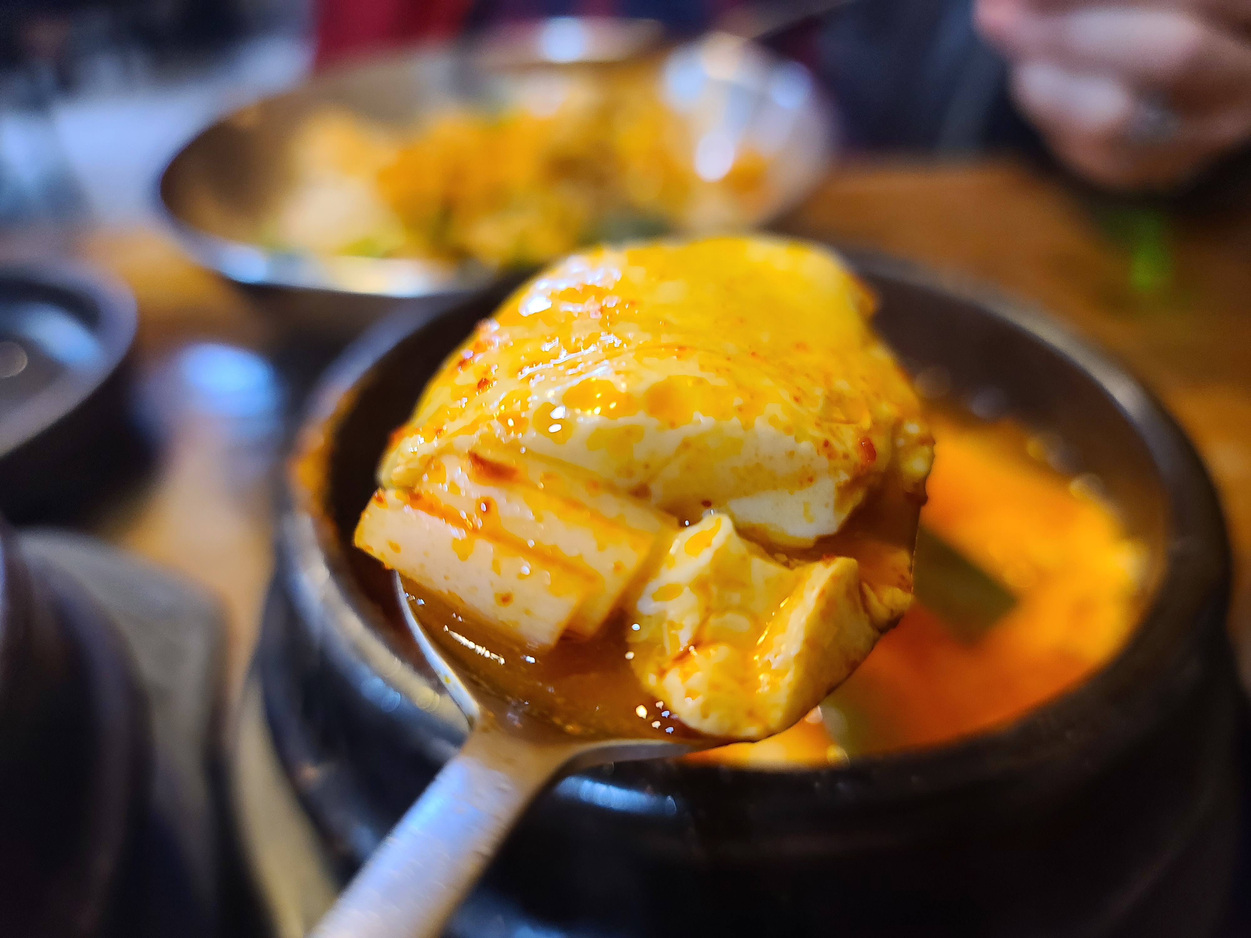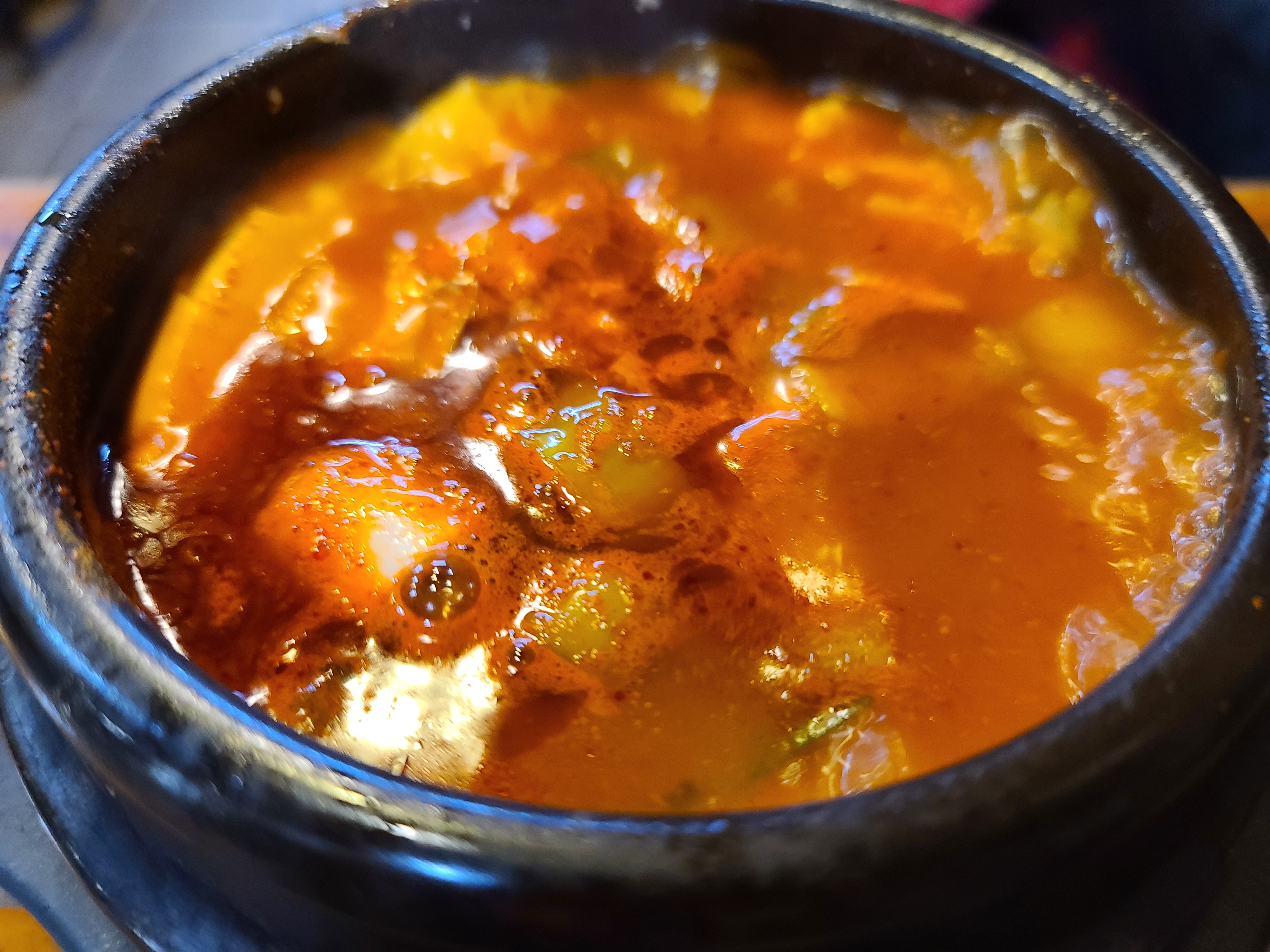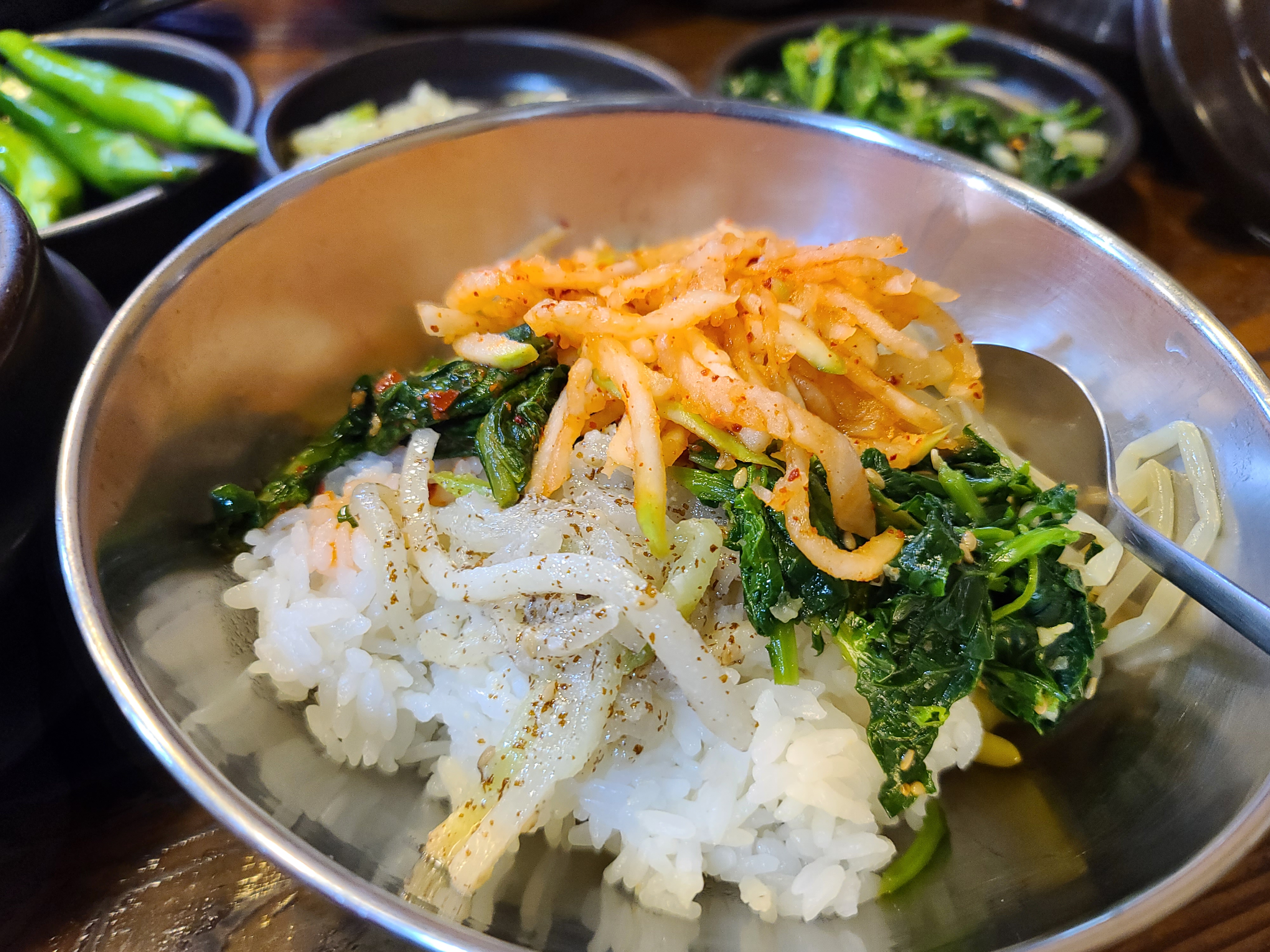 기본적인 나물 반찬 4가지가 먼저 테이블에 놓이고 넓은 대접에 밥이 나온다. 그냥 비빔밥으로 먹어도 맛있지만 순두부와 청국장이 뚝배기에 보글보글 끓여 나오기에 같이 비벼 먹으면 마파람에 게눈 감추듯 순식간에 해치우게 된다.