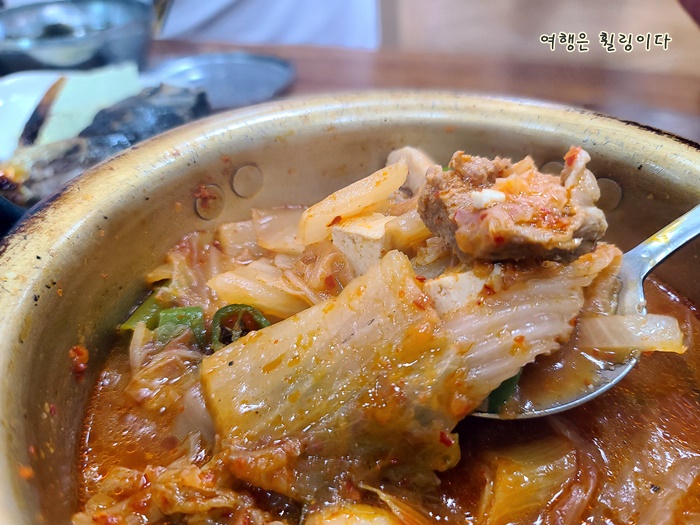 한 냄비 가득 나오는 김치찌개도 칼칼하니 맛있어요. 참고로 1인이 가도 식사가 가능하니 부담없이 가셔도 될 듯 합니다. 요즘엔 혼자 여행하는 분들이 많이 늘다 보니 그런 점도 참고해 장사를 하시더라고요.