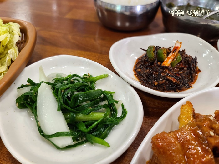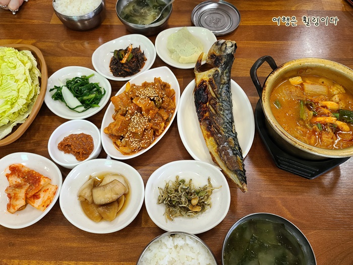 보통 기본 정식으로 나오는 것은 각종 반찬과 제육볶음 그리고 고등어구이인데 일부러 정식 2개 시킬 필요는 없더라고요. 김치찌개와 정식 하나씩 주문해도 나오는 기본 반찬은 같고요. 오히려 김치찌개 양이 많아 같이 나눠 먹기 좋았습니다. 처음 가시는 분들은 참고하시면 푸짐한 한 상을 드실 수 있을거예요.