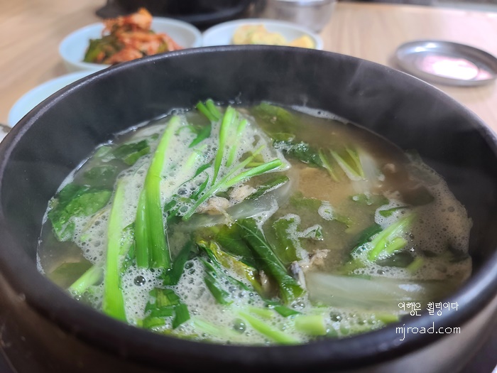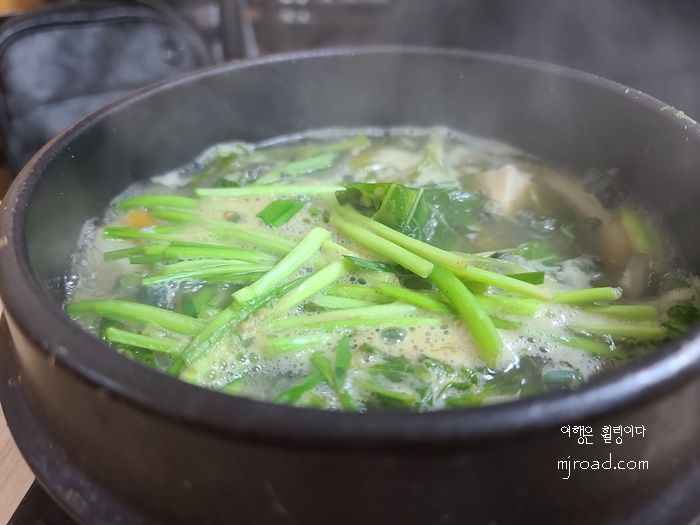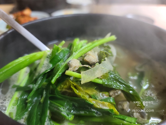 주문한 음식이 나왔다. 생각보다 큰 뚝배기에 한가득 나왔다. 생각보다 많은 양에 놀랐다. 신선한 채소와 다슬기, 재첩이 그냥 보기에도 보일 정도로 푸짐하게 들어 있었다.