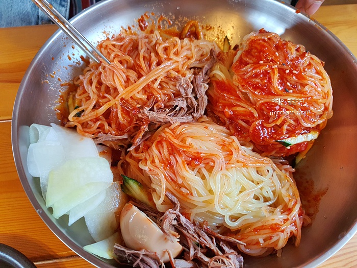 생각보다 많아 보이는 양이라 난 보통으로 먹기로 하고 비빔밀면 하나는 잘 먹는 짝꿍에게 넘겼다. 고명으로 올라간 고기도 맛있고 달걀도 맛있다. 물론 매콤한 양념은 밀면을 술술 잘 넘어가게 했다.