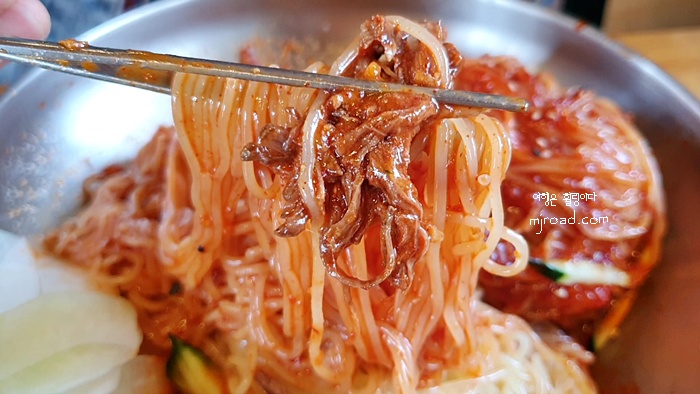찬은 무 김치가 하나 나온다. 맛은 삼삼하니 매운 비빔밀면과 먹기에 이만한 반찬이 없을 듯 하다.