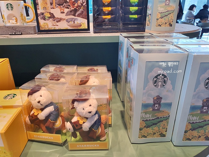 제주도 스타벅스에서 만날 수 있는 제품들은 어떤 것들이 있을까? 돌하르방을 닮은 곰돌이 캐리어에 이쁘게 장식할 택 세트를 비롯해 텀블러, 컵등 다양하다. 직접 보면 하나쯤은 사오고 싶은 그런 제품들이 많아 자꾸 손이 간다.