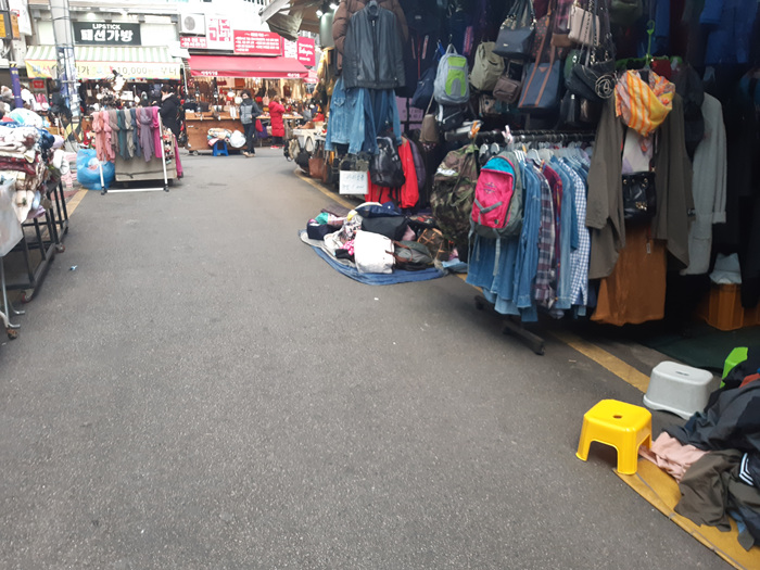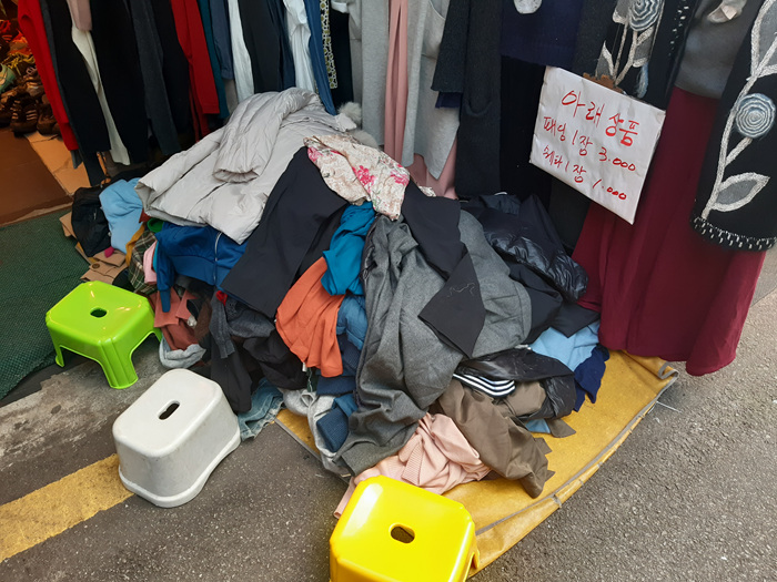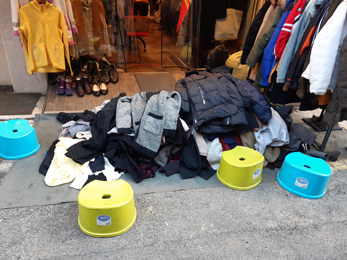 국제시장 곳곳엔 재미난 것들도 볼 수 있는데요.. 오늘은 서울 동묘시장 보다 정말 많이 저렴한 국제시장의 구제의류 사진으로 담아 봤습니다. 국제시장 골목을 거닐다 보면 심심찮게 보게 되는 건 바닥에 놓은 옷들과 목욕탕 의자입니다.