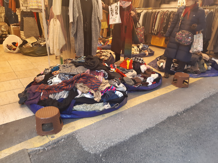 처음 목욕탕에서 보던 의자가 바닥에 많이 놓여 있길래 뭔가 했더니..... 의자에 앉아서 옷을 고르라는 상인들의 배려더군요. 물론 앉아서 옷을 고르면 한 개 고를 걸 두 개 ~ 세 개는 고를 듯합니다.
