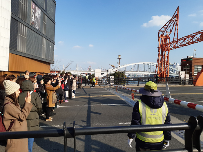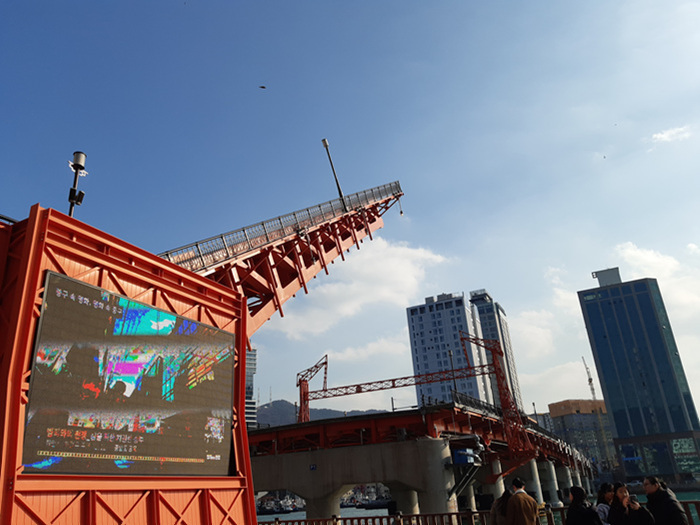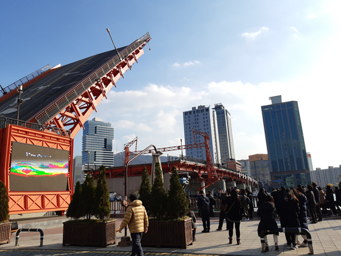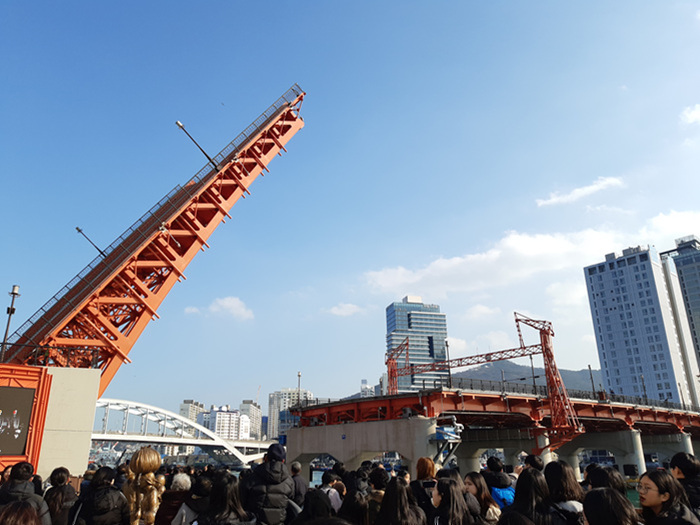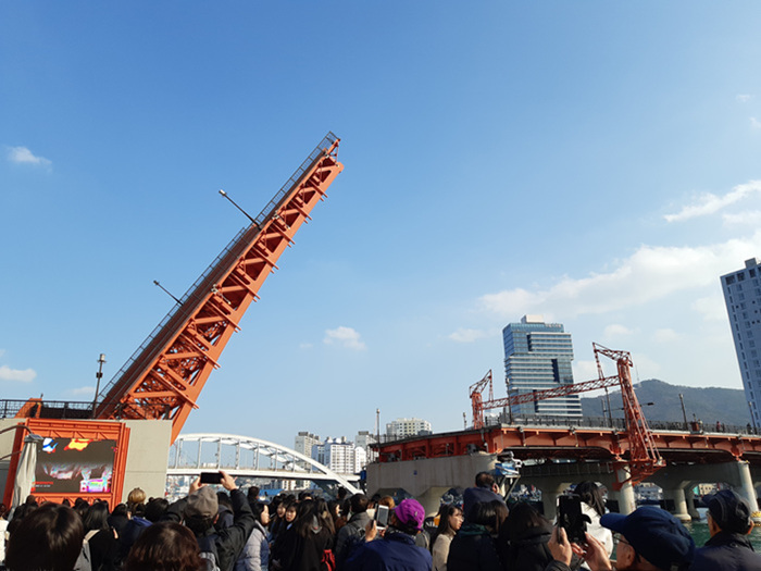 영도다리가 올라가는 모습을 촬영하는 외국인 관광객들과 국내 관광객들