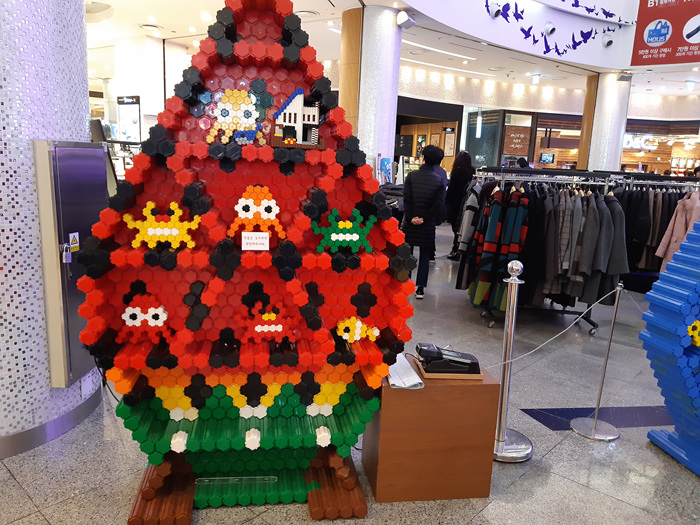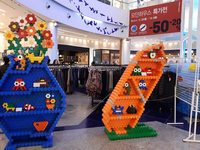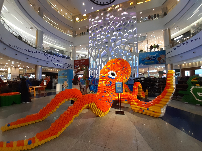 평소 자세히 보지 않았던 곳을 우연히 보게 되었는데요. 그건 바로 블록체험을 하는 곳인데 멋진 블록작품을 만들어 놓은 모습이었죠..그리고 한 가지 더 기네스북에 등재된 세계 최고의 실내 아쿠아틱쇼를 보게 되었습니다. 백화점내에 이렇게 웅장한 모습이라니 그저 한참을 보게 되었습니다.