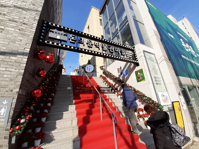 돈의문 박물관 마을입구입니다. 마치 레드카펫을 밟고 올라가는 느낌이 듭니다. 그냥 높은 계단보다 이렇게 해 놓으니 왠지 모를 운치가 있어 좋습니다. 마치 이곳 마을의 주인공으로 입장하는 것 같기도 하고...