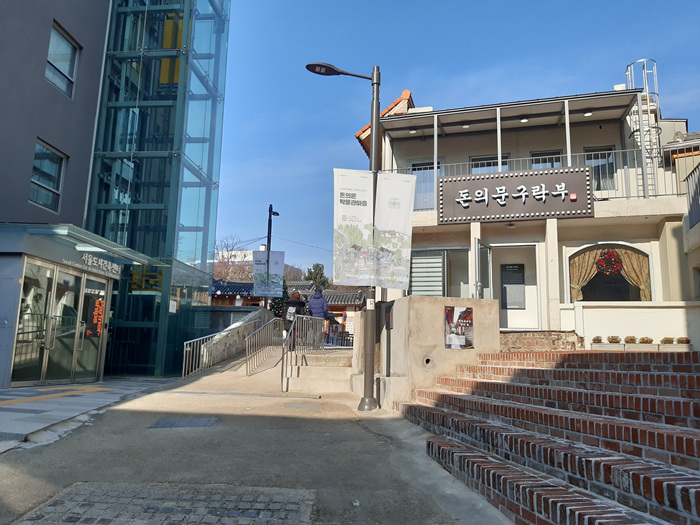 돈의문 박물관 마을입구입니다. 마치 레드카펫을 밟고 올라가는 느낌이 듭니다. 그냥 높은 계단보다 이렇게 해 놓으니 왠지 모를 운치가 있어 좋습니다. 마치 이곳 마을의 주인공으로 입장하는 것 같기도 하고...