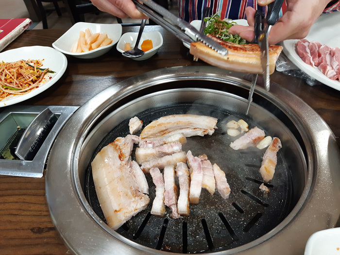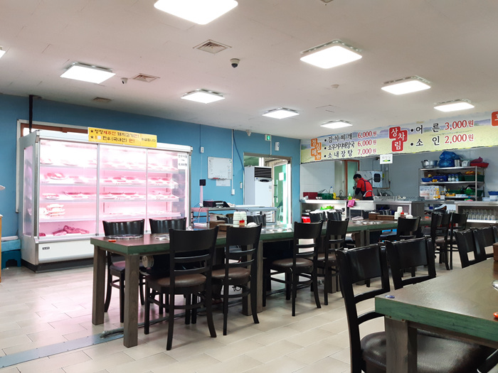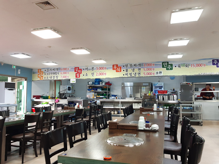 참고로 상차림은 여느 음식점과 비슷하게 나옵니다. 처음엔 상차림을 한 번 기본으로 해 주고 찬이 모자랄 경우엔 셀프로 갖다 먹으면 됩니다. 단, 상추, 콩나물무침은 종업원에게 주문하는걸로....