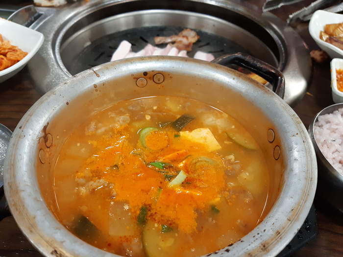 된장찌개에 고기도 듬뿍 들어 있습니다. 물론 맛도 좋아 배가 불러도 밥 한그릇 뚝딱하게 만드는 묘한 매력이 있었습니다. 제주도라고 하면 음식점에서 먹는 고기가 비싸다라는 편견이 있는데 그 편견을 싹 갈아 엎는 그런 음식점이었습니다.