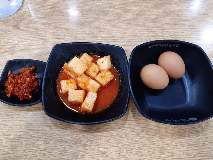 콩나물국밥을 주문하면 찬은 깍두기와 젓갈 뿐이지만 그래도 이것으로 충분하지요.