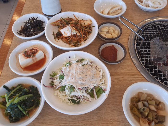 고깃집으로 유명한 이곳은 점심특선으로 흑돼지&돌솥밥을 단돈 만원에 제공합니다. 반찬도 여느 고기집 세팅과 견주어도 손색이 없습니다.