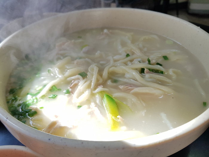 넓은 그릇에 한가득 담긴 닭칼국수가 나왔습니다. 혼자 먹기에 제법 많은 양이라 둘이서 가면 칼국수 한그릇과 김밥 한~두줄 주문해 먹곤 합니다.