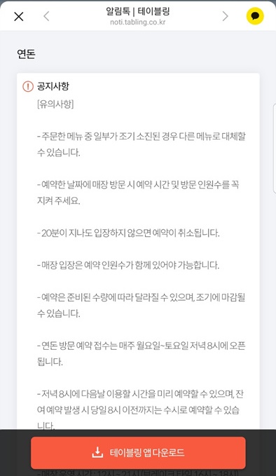 예약이 되면 자세한 안내공지와 주소가 카카오톡으로 들어 옵니다. 그리고 예약한 당일에 몇 번의 안내문자도 보내주니 까 먹는 일 없이 예약된 가서 음식 잘 드시길요..