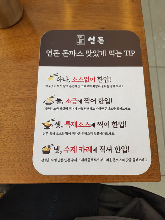 돈까스 맛있게 먹는 법도 테이블에 붙어 있더군요. 사실 이런거 없어도 그냥 고기 자체가 맛있어서 놀랐습니다. 연돈 돈까스 사장님 최고!
