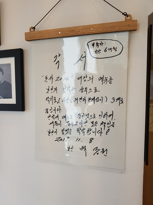 캬.... 백종원님의 각서도 보이고 방송에서 보던 글이 입구에 딱 붙어 있네요. 초심을 잃지 않고 잘 하시겠지요.