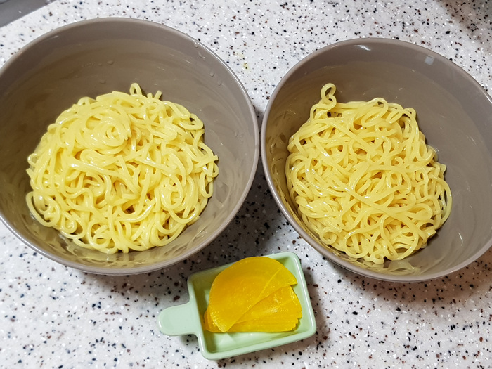 짱면 만드는 방법도 생각보다 쉬웠습니다. 먼저 면을 삶아서 찬물에 헹군 뒤 채에 받쳐 준 후 다른 재료들을 조리하면 됩니다.
