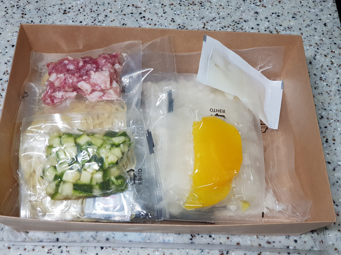 짜장면 밀키트 내용물은 고기, 호박, 당근, 소스, 단무지 그리고 면 2인분이 들어 있습니다.