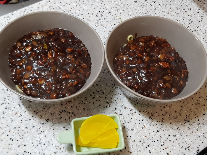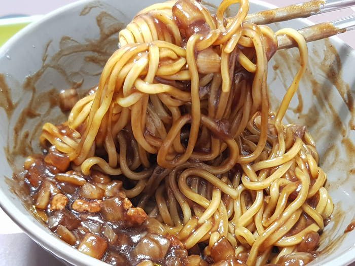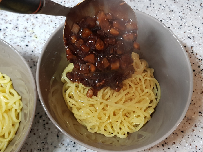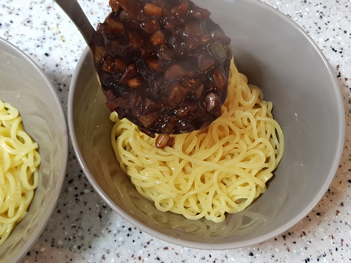 찬물에 헹궈 놓은 면에 뜨거운 짜장을 부으니 여느 중국음식점 못지 않은 비주얼이었습니다.