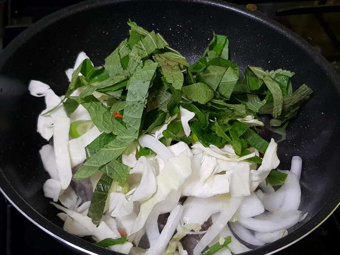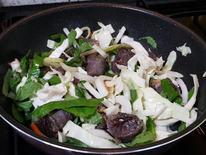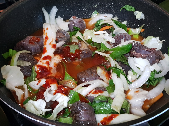 순대를 볶은 후에는 각종 채소를 넣고 한 번 더 볶아 줍니다. 채소가 숨이 조금 죽을때쯤에 양념을 넣어 한 번 더 볶아주면 됩니다.