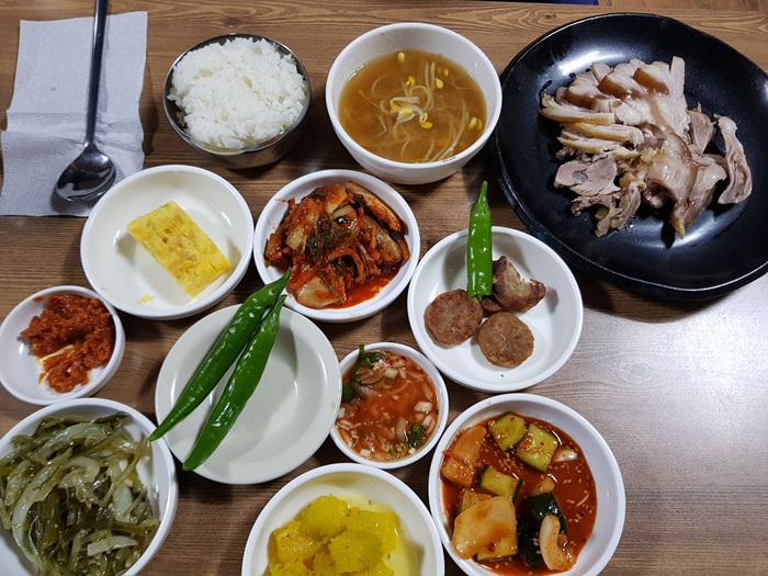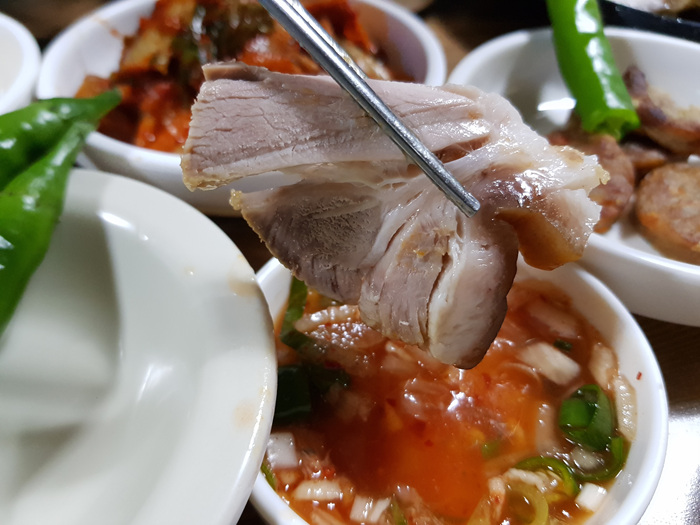 반찬을 테이블에 놓고 바로 편육이 나왔습니다. 그런데 육지에서 먹던 그런 편육이 아니었습니다. 조금 당황했지만 그래도 고기를 워낙 좋아하기에... 한 번 먹어 보니...맛은 나쁘지 않더군요. 쫄깃한 식감이 괜찮았습니다.