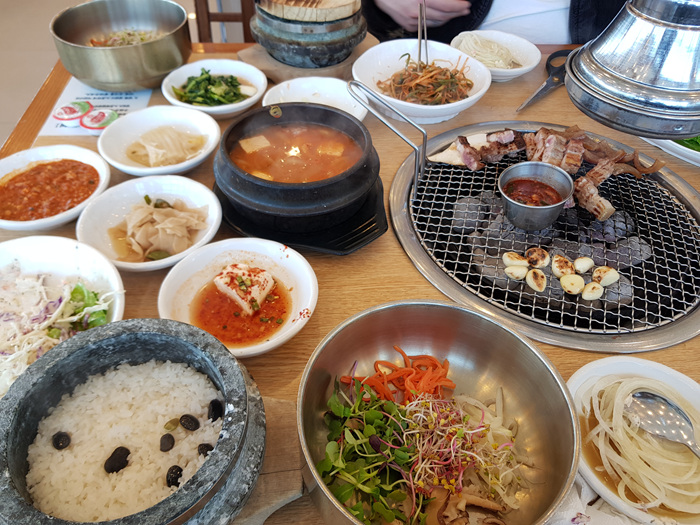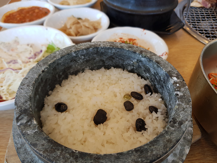 고기를 다 구울 즈음엔 돌솥밥도 맞춰 나옵니다. 거기에 밥을 비벼 먹을 수 있는 채소도 한 그릇 나오지요.