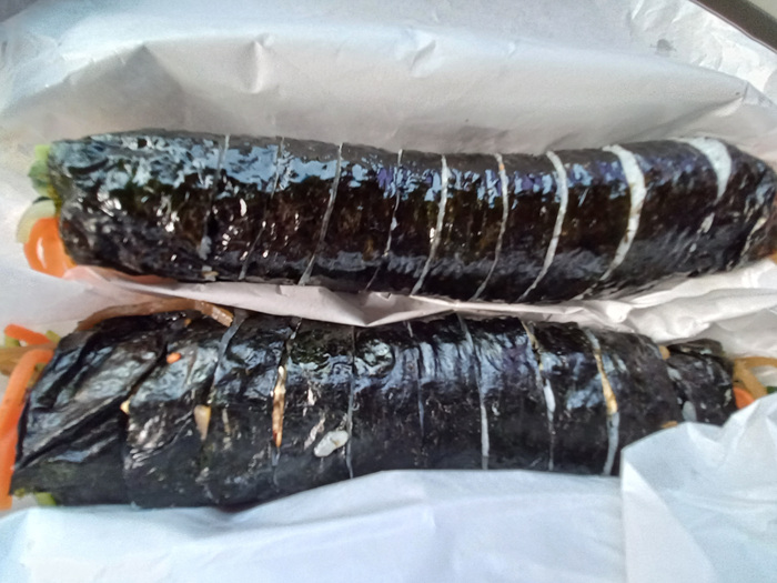 2명이서 3줄 처음엔 양이 적을 줄 알았는데 먹다 보니 배가 부르더군요. 정말 한끼 식사로 충분한 그런 김밥이었습니다.