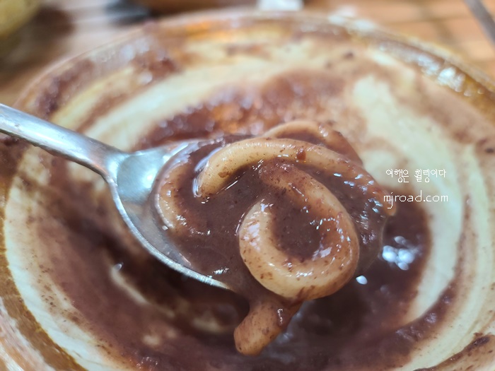 처음부터 설탕을 넣어 먹으면 설탕 양이 많이 들어가니 마지막 한 두어 숟가락이 남았을때 넣어 먹으면 그 맛이 정말 꿀맛이다. 전라도에서는 팥칼국수에 소금 대신 설탕을 넣어 먹는데 여기도 마찬가지다.