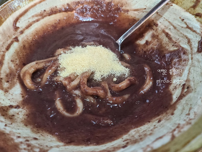 처음부터 설탕을 넣어 먹으면 설탕 양이 많이 들어가니 마지막 한 두어 숟가락이 남았을때 넣어 먹으면 그 맛이 정말 꿀맛이다. 전라도에서는 팥칼국수에 소금 대신 설탕을 넣어 먹는데 여기도 마찬가지다.