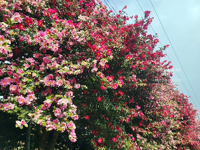 드라이브를 하다보면 어딜 가나 만나게 되는 겨울철 붉게 타오르는 동백꽃은 지나가는 사람들의 발길을 붙잡기에 충분하다.