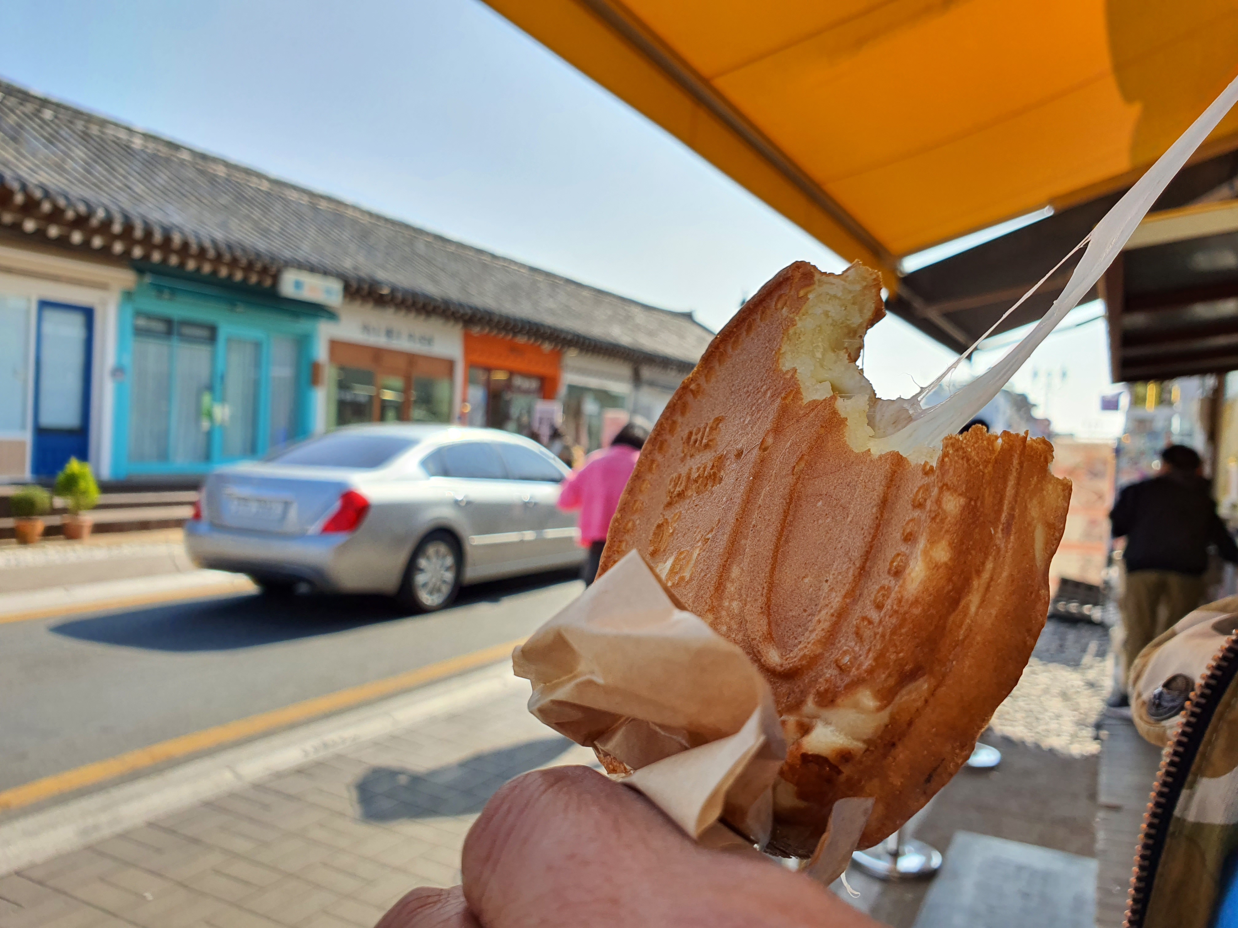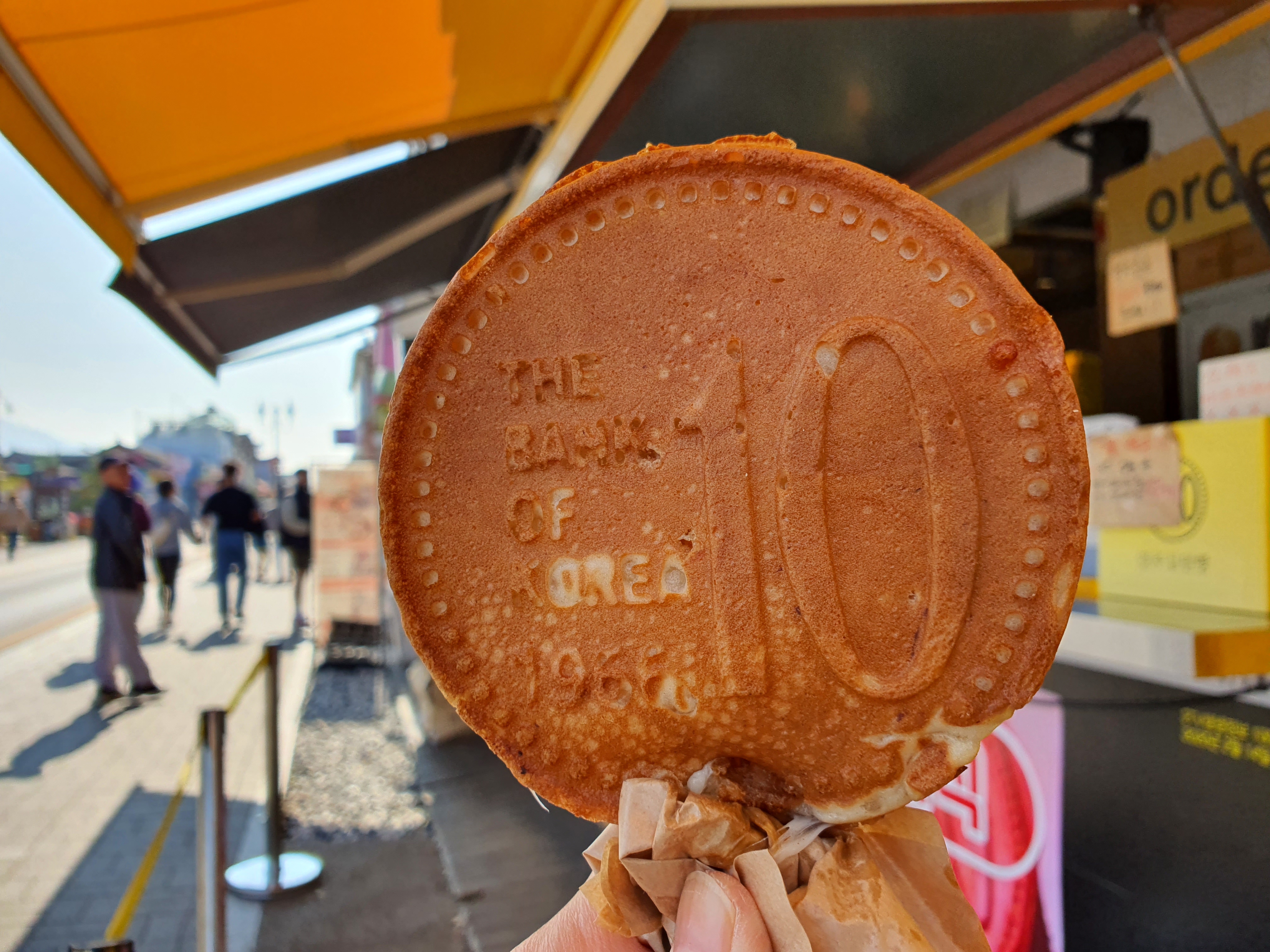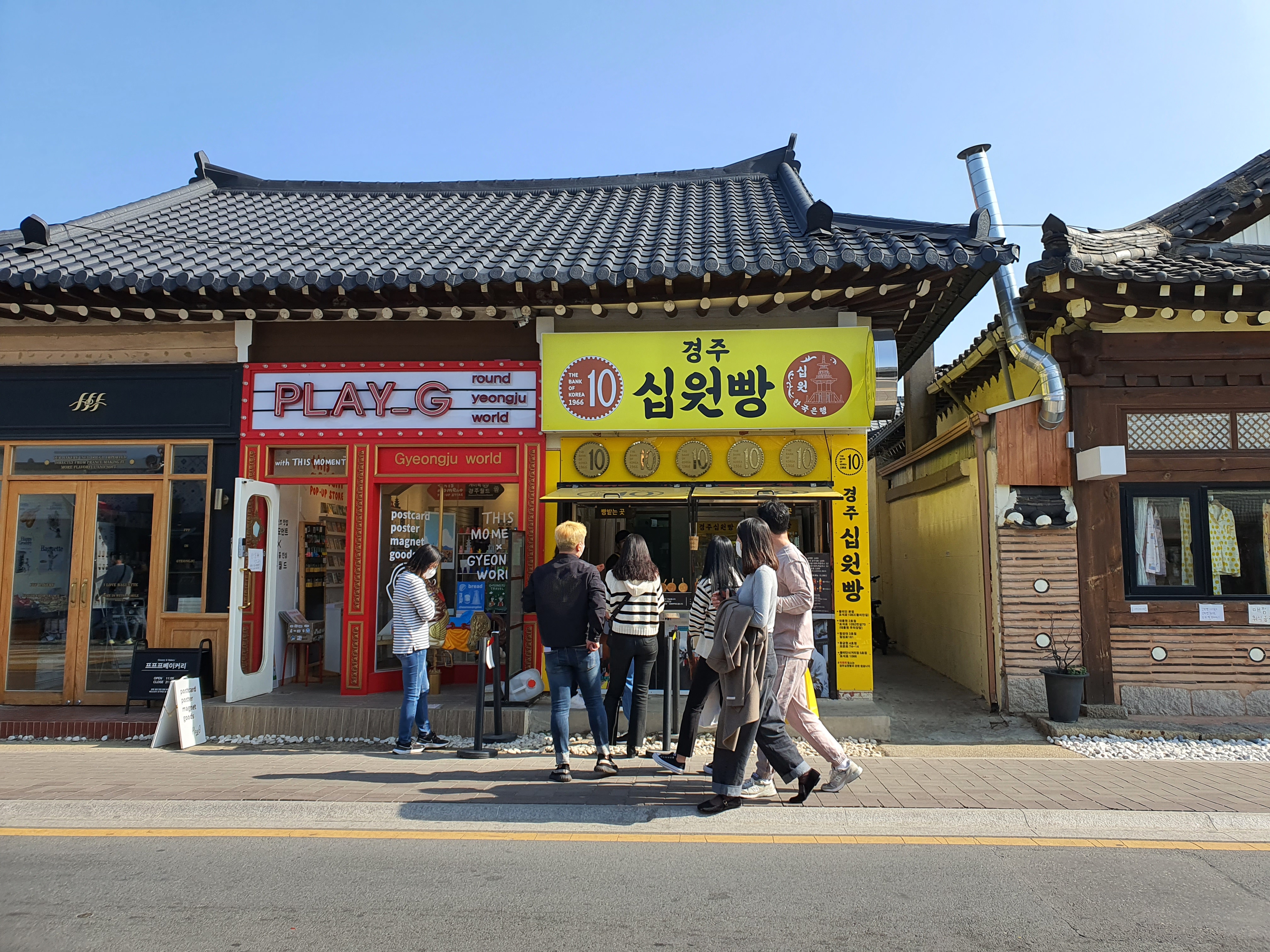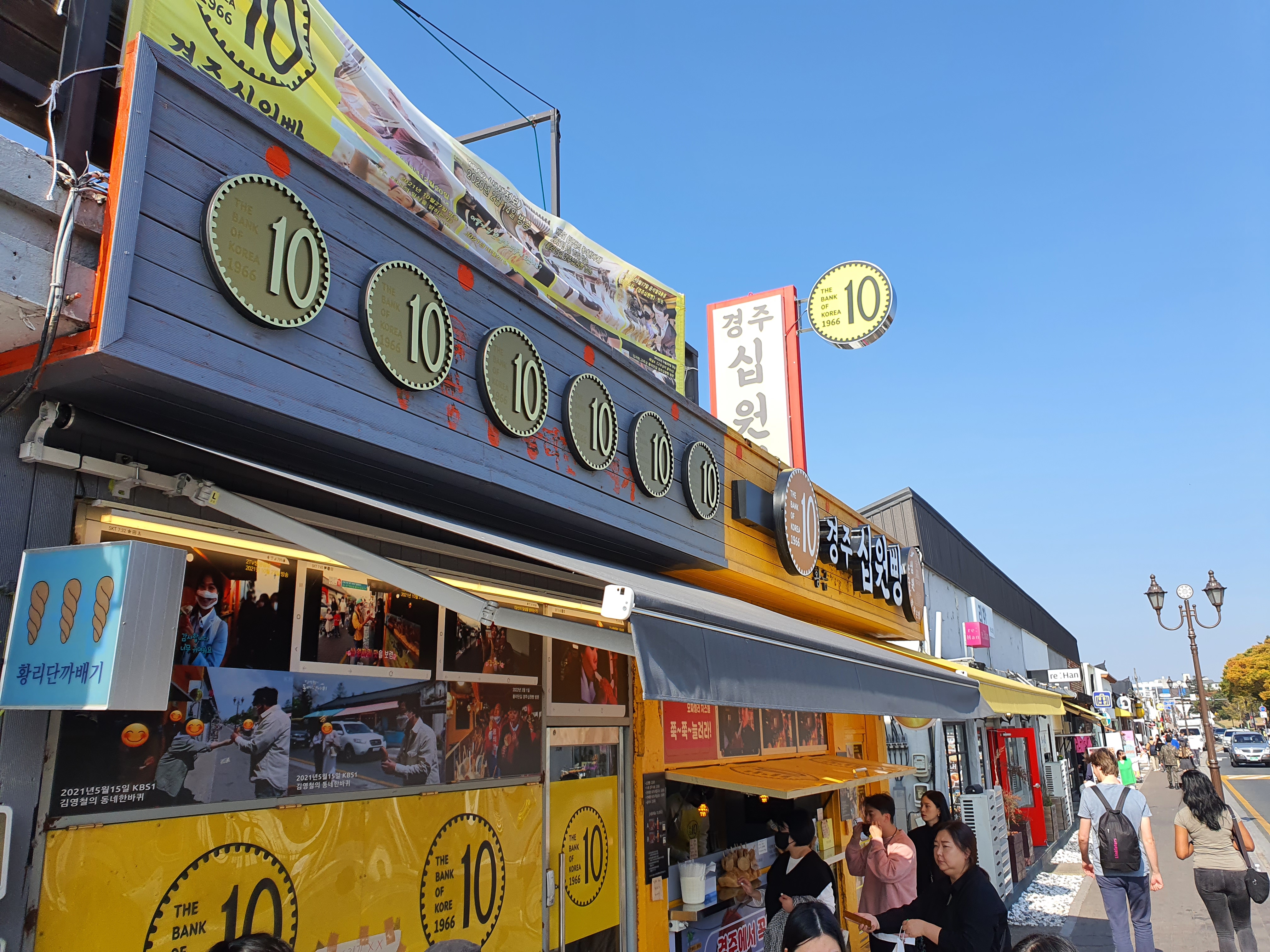 경주에서 제일 많은 사람들이 몰리는 황리단길은 10원짜리 빵 파는 곳이 많다.