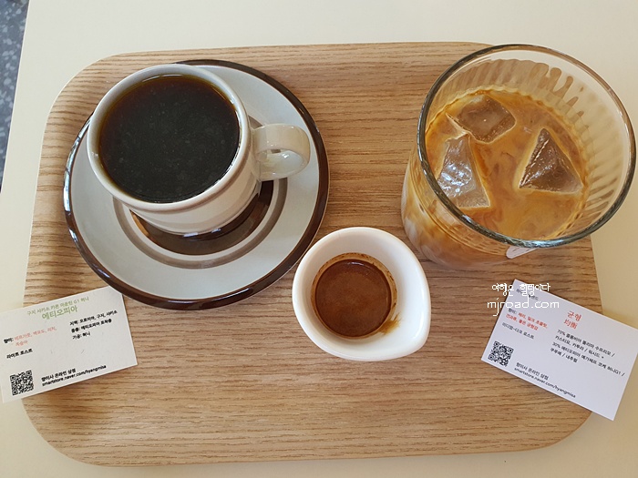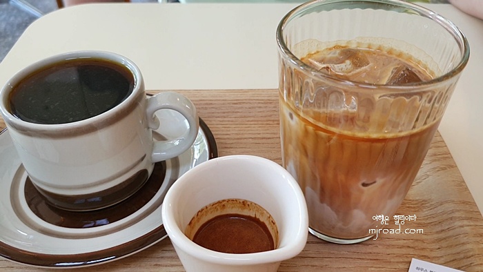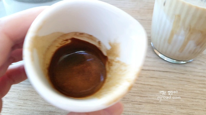 우린 드립커피 한 잔과 아이스라테를 주문했다. 라테에 넣어 먹기 위해 샷 추가를 했다. 그랬더니 에스프레소 잔에 담아 주는 센스..