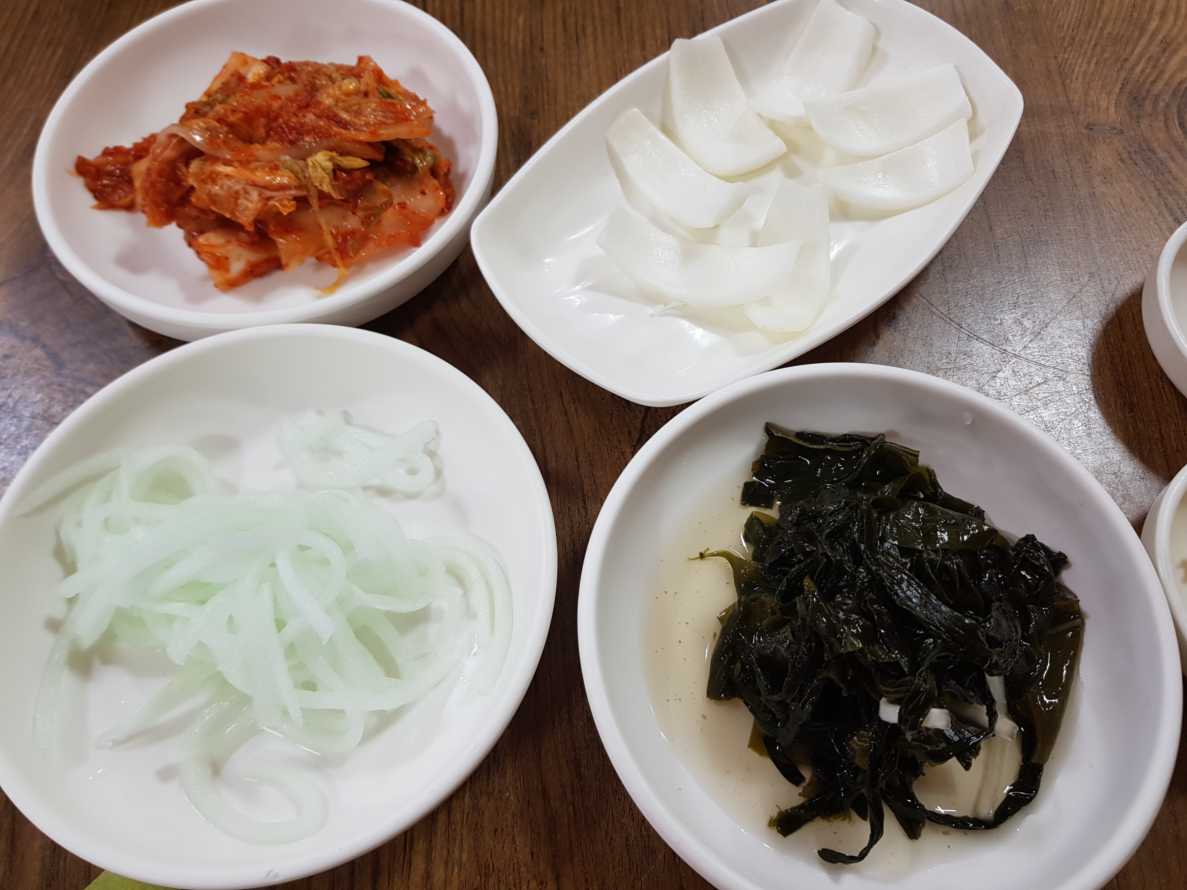김치, 무생채, 양파, 미역 이렇게 4가지가 나옵니다.