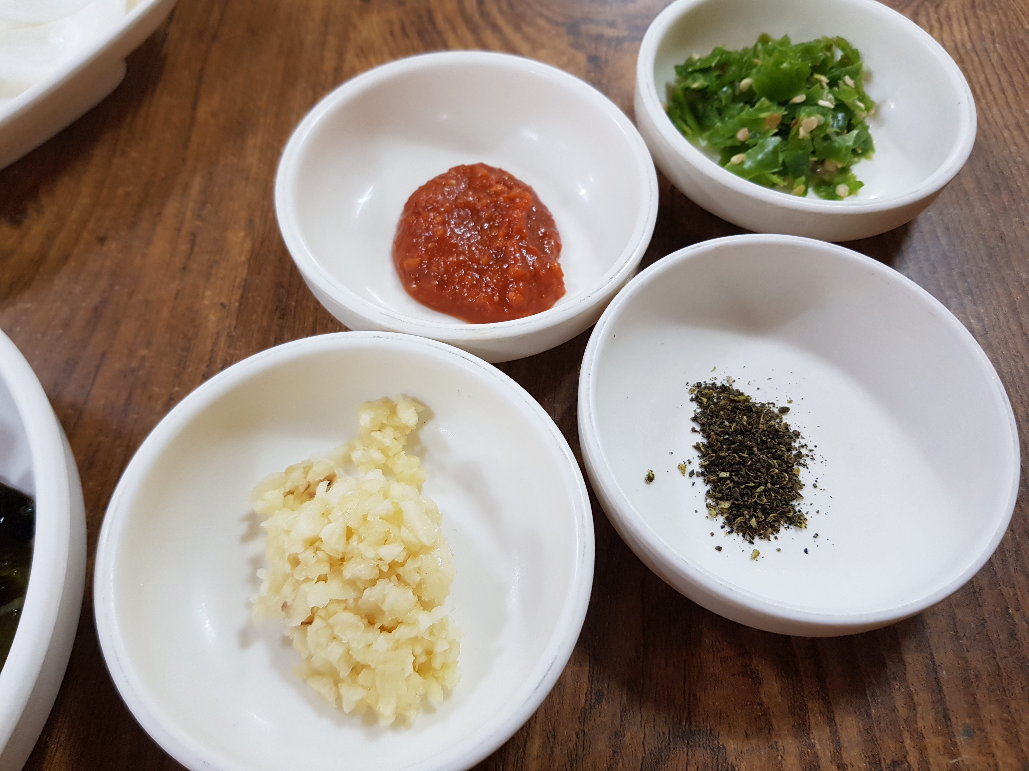 거기에 추어탕에 넣어서 먹는 간마늘, 간고추, 산초, 양념이 나오고요.