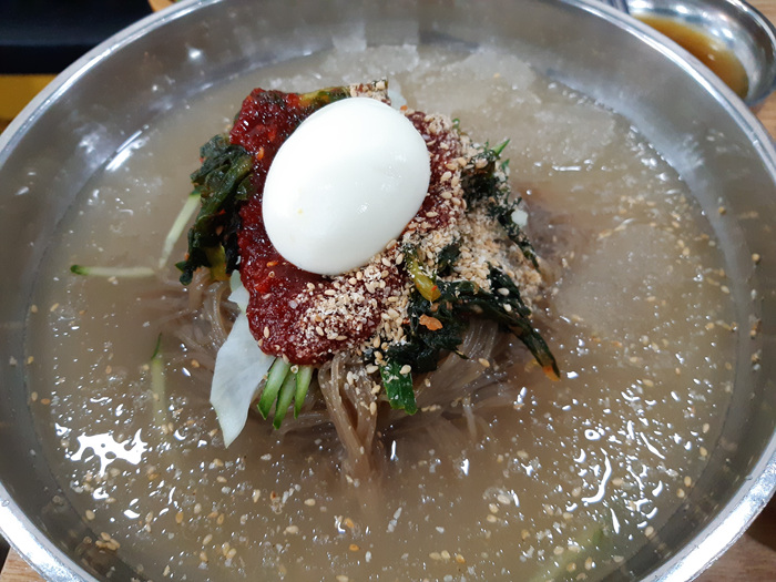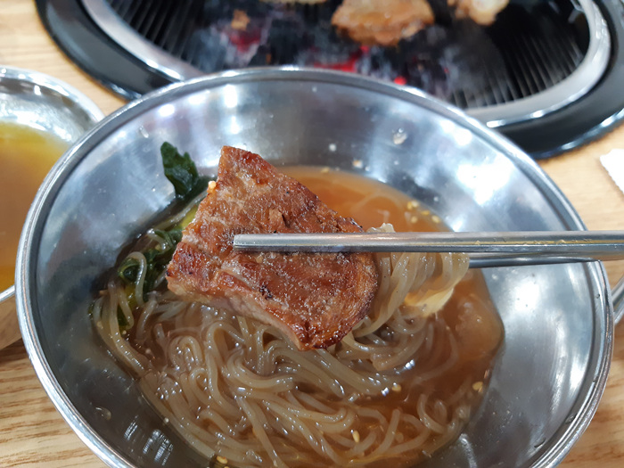 고기가 맛있게 구워질 무렵.... 냉면이 나왔습니다. 한겨울에 무슨 냉면이냐구요..이 음식점에선 냉면이 고기만큼 많이 나간다고 하더라구요. 물론 SNS에도 핫하다고 소문이 자자해 주문했지요.