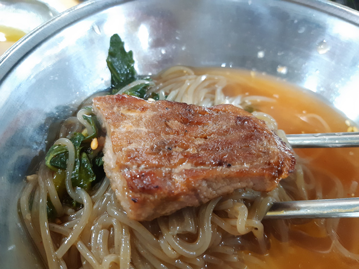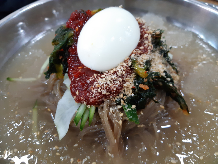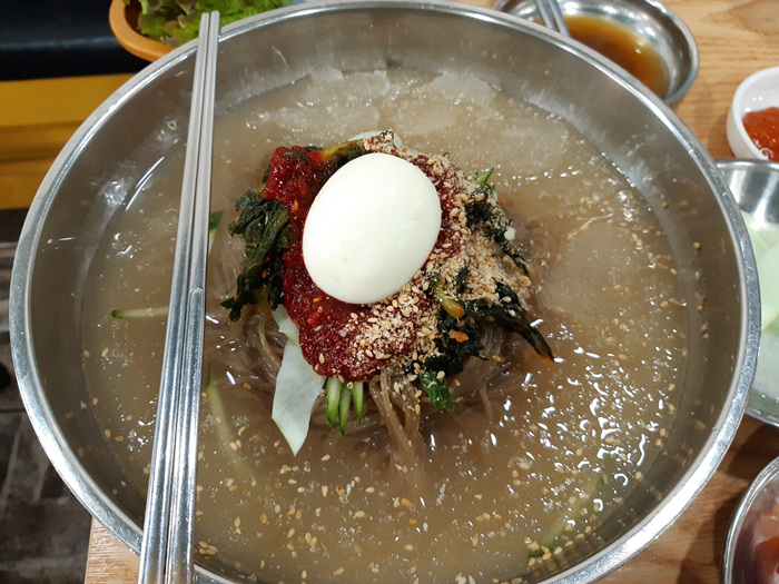 얼마나 그릇이 크냐면 젓가락을 그릇 중앙에 두면 그냥 빠집니다. 옆에 살짝 걸친 상태로 사진 촬영..... 양도 다른 음식점에서 나오는 것 보다 푸짐합니다. 거기다 열무냉면 같은 느낌이 많이 들었고 맛도 조리료 맛이 그렇게 강하지 않아 좋았습니다.