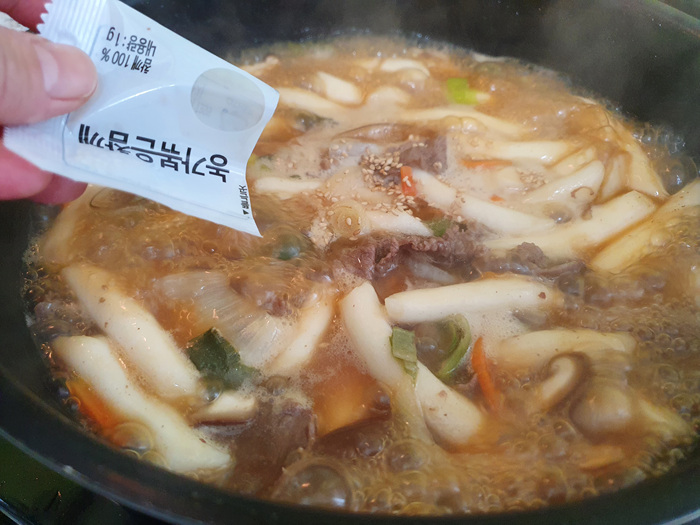 팬에 오일 1큰술을 넣고 소고기를 강불에 1분간 볶습니다. 팬에 물 300ml(종이컵 2컵 )과 떡볶이 떡, 양념, 표고버섯을 넣고 강불로 3분 30초간 조리합니다.