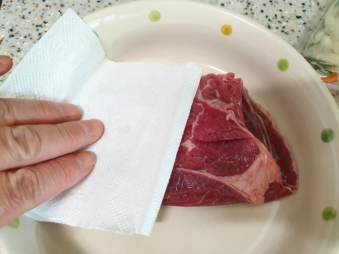 소고기는 키친타월에 핏물을 제거한 뒤 먹기 좋은 크기로 썰어 준비합니다.