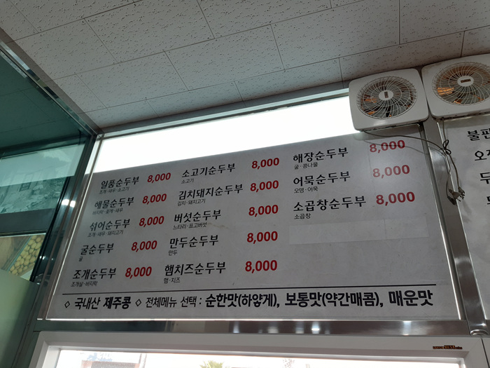 순두부 종류가 많으니 평소 즐기는 음식들이 있으면 골라 드시길요... 국내산 제주콩을 사용했고요. 전체메뉴 매운맛, 보통맛등 선택가능합니다. 어르신들은 대부분 고추가루가 들어 가지 않은 순한맛을 드시더군요.