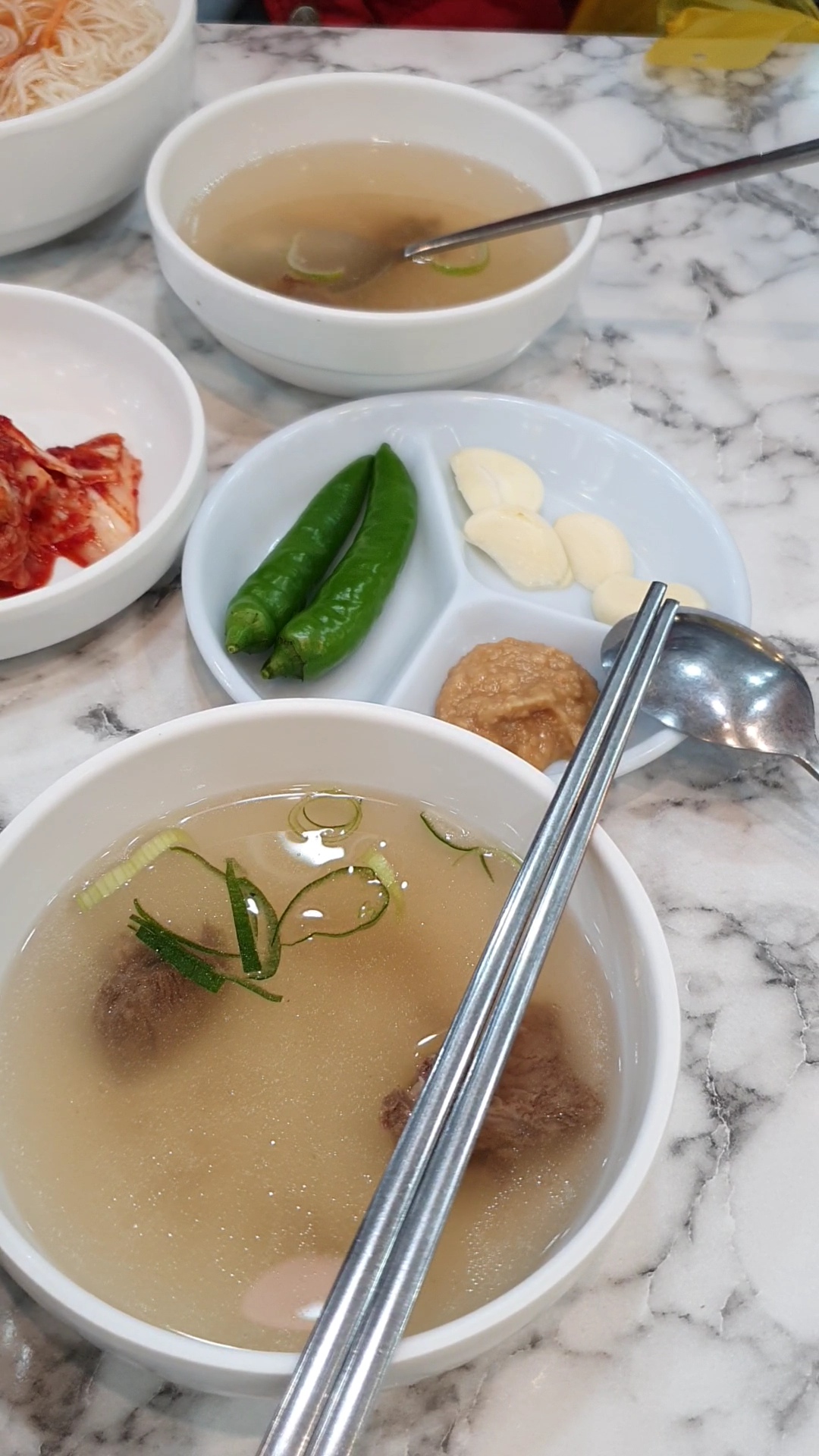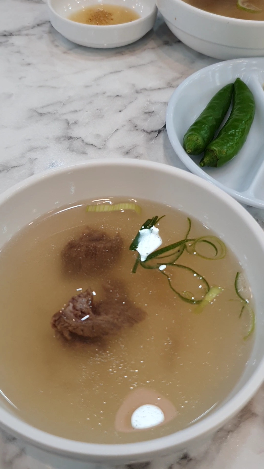 주문을 하면 간단한 찬과 국이 나온다. 국은 고기 몇 덩이 들어갔는데 국물이 진국이다. 고기국을 즐기지 않는다면 조금 느끼할수도 있다.