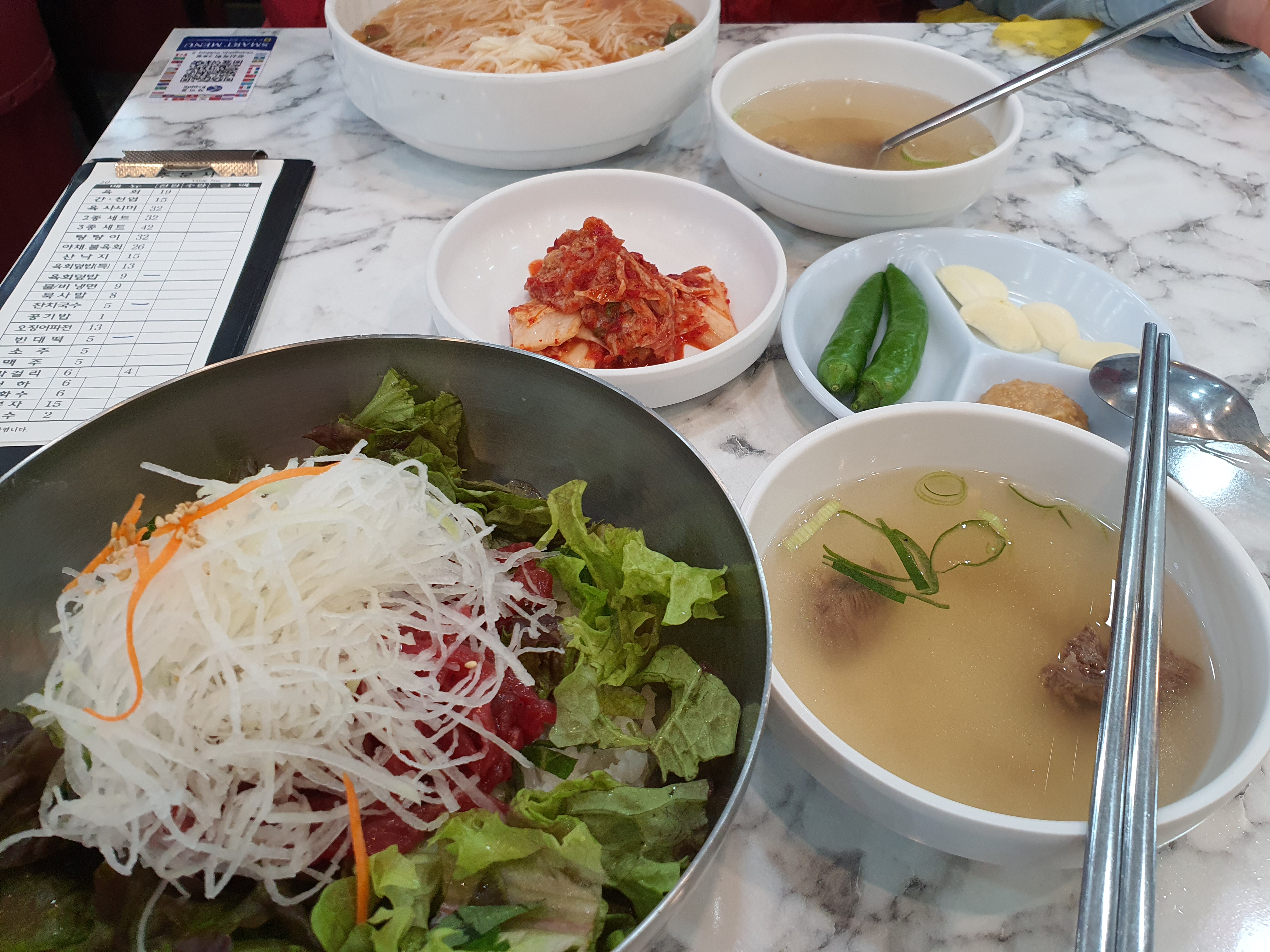 주문한 메뉴는 육회 비빔밥, 국수, 녹두 빈대떡이다.