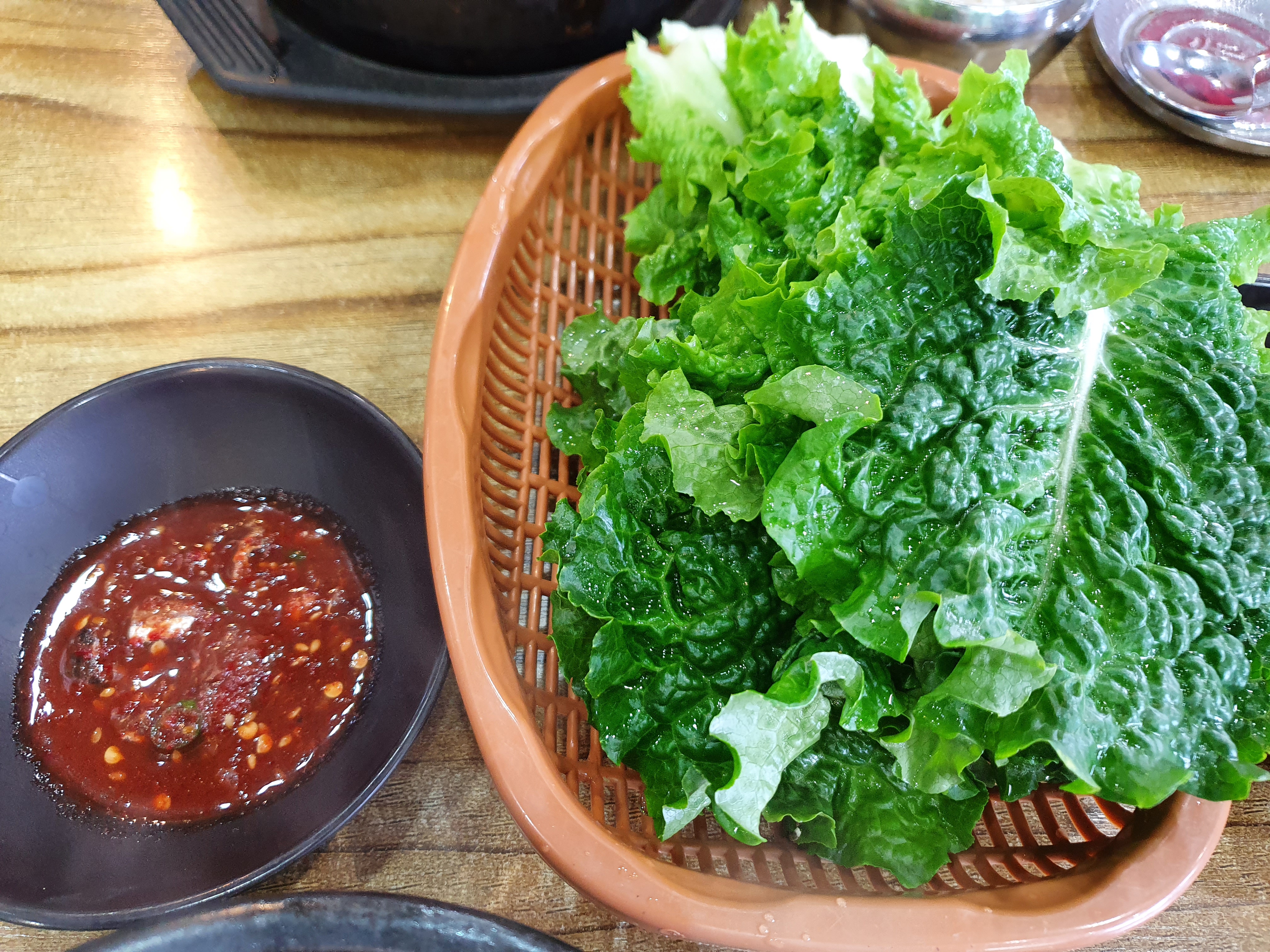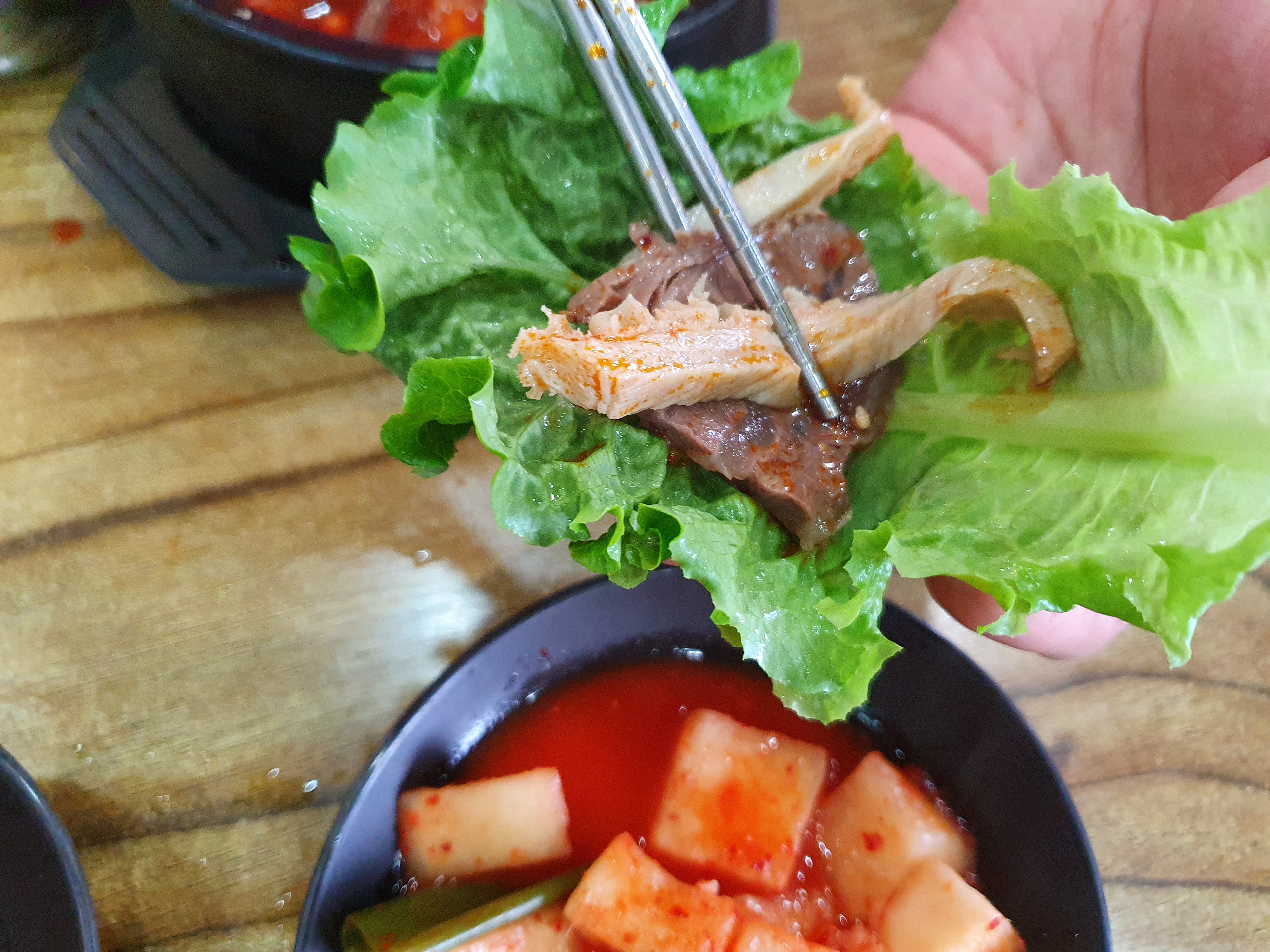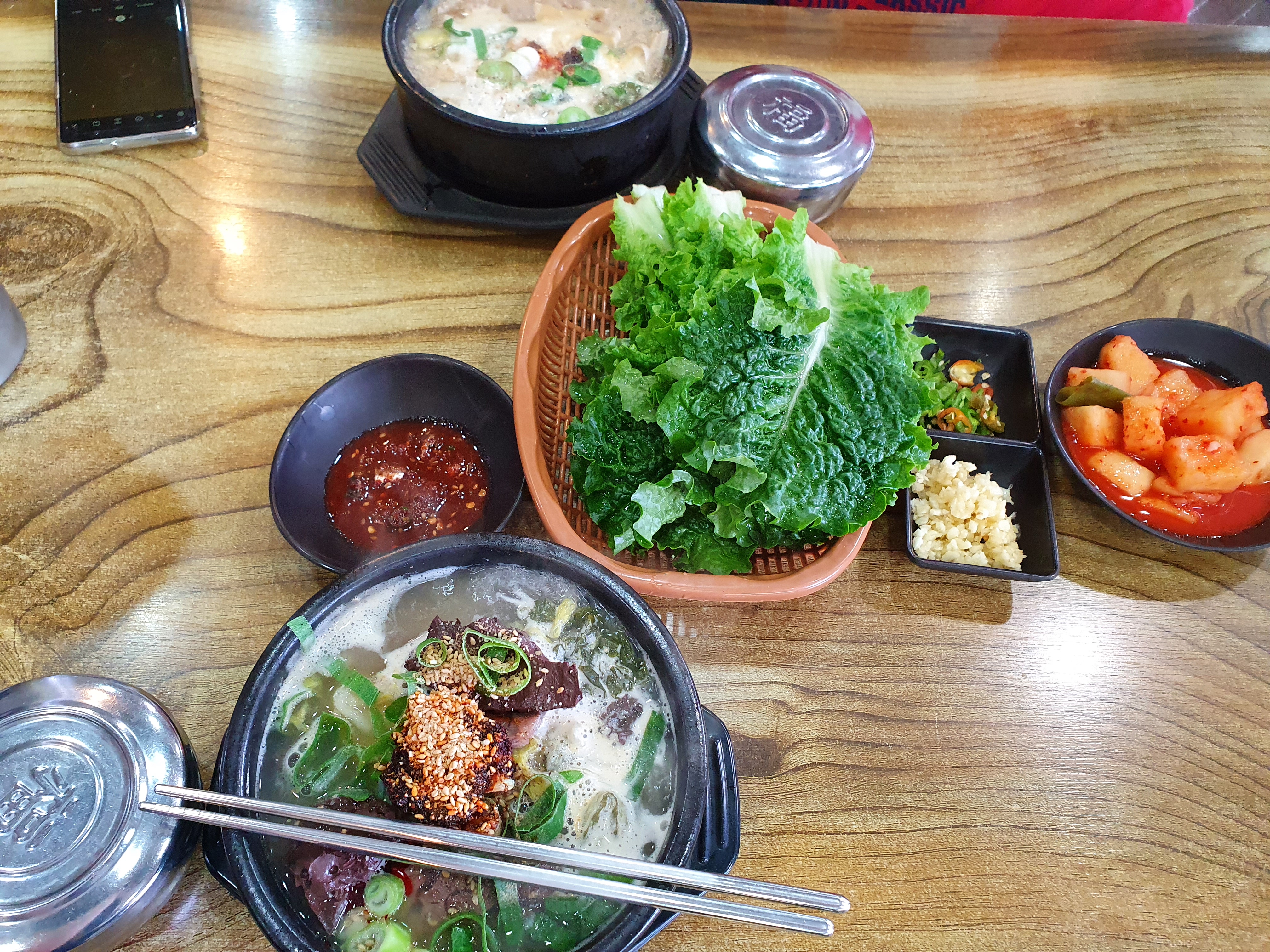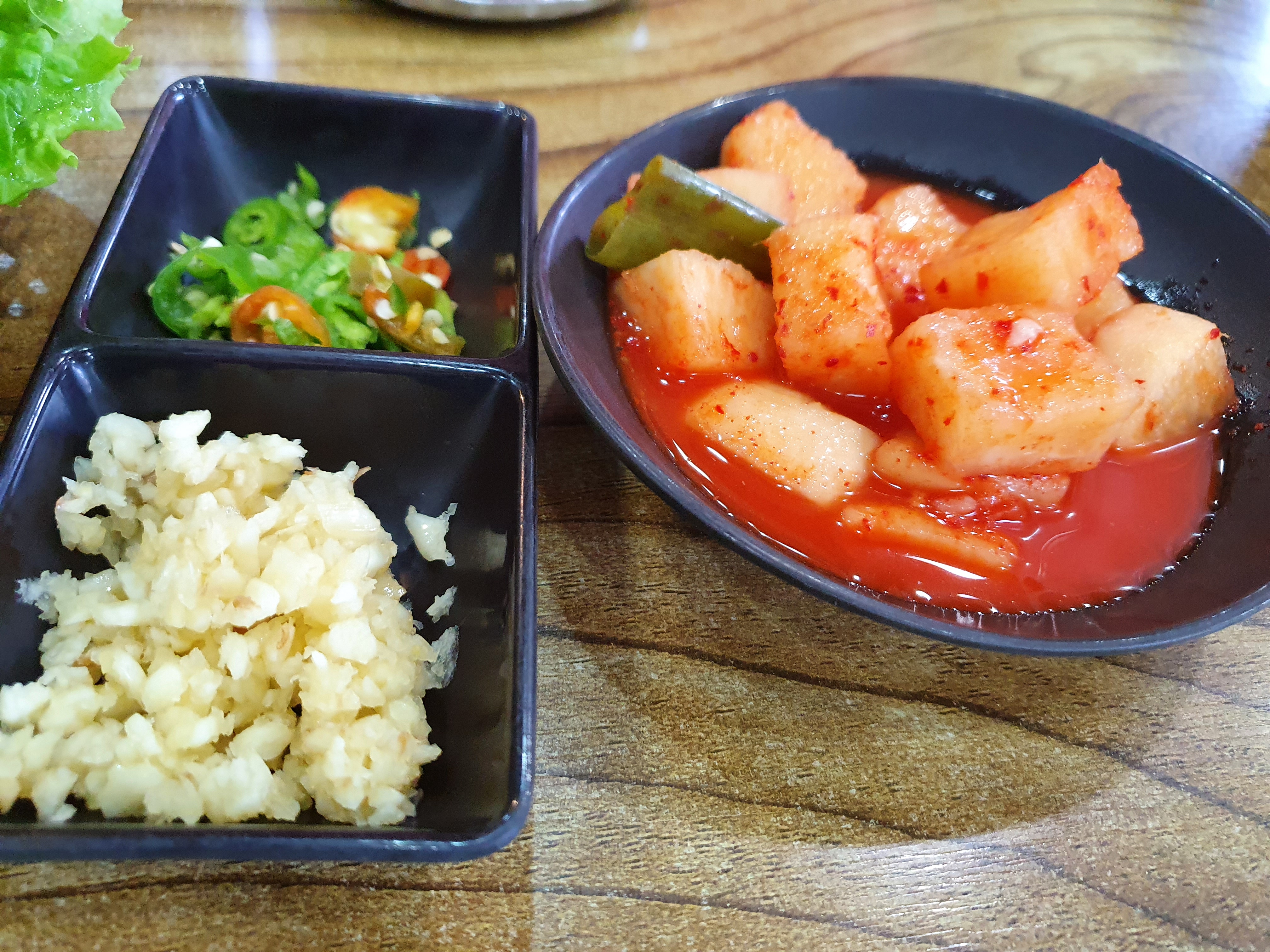 찬은 여느 해장국집과 마찬가지로 깍두기와 상추 그리고 탕에 넣어 먹는 간 마늘, 간고 추가 나옵니다.